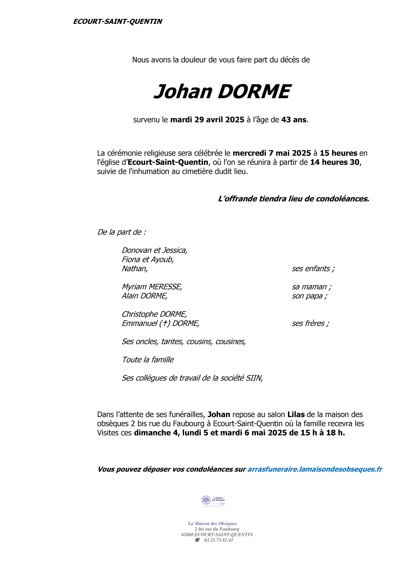Cet espace « condoléances » est dédié à la mémoire de Monsieur Johan DORME.