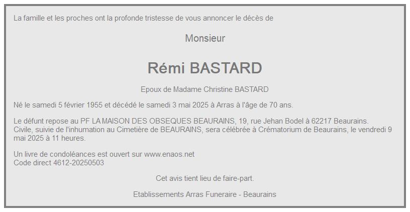 Cet espace « condoléances » est dédié à la mémoire de Monsieur Rémi BASTARD.