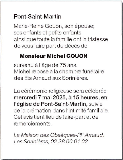 Décédé à Pont-Saint-Martin (44860) le vendredi 2 mai 2025