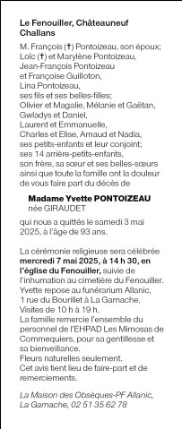 de Madame Yvette PONTOIZEAU née GIRAUDET