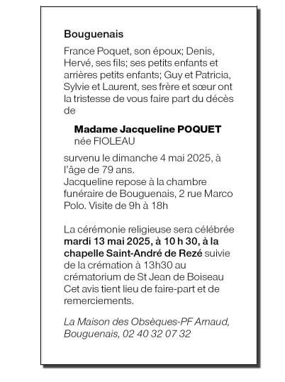 Cet espace « condoléances » est dédié à la mémoire de Madame Jacqueline POQUET née FIOLEAU.