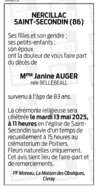 Cet espace « condoléances » est dédié à la mémoire de Madame Janine AUGER née BELLEBEAU.