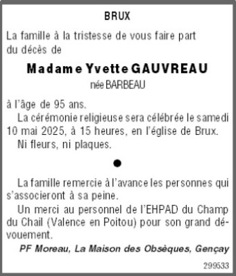 de Madame Yvette GAUVREAU née BARBEAU