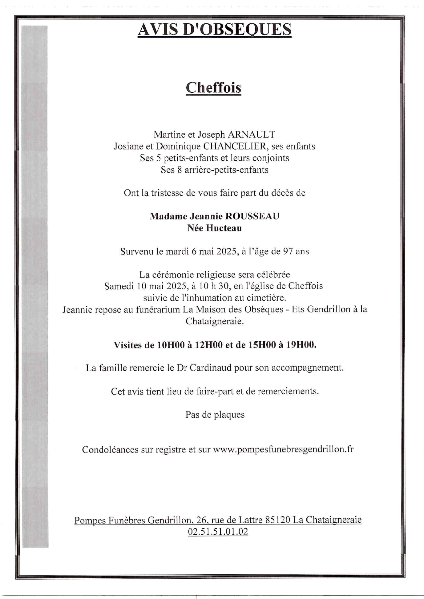 Cet espace « condoléances » est dédié à la mémoire de Madame Jeannie HUCTEAU.