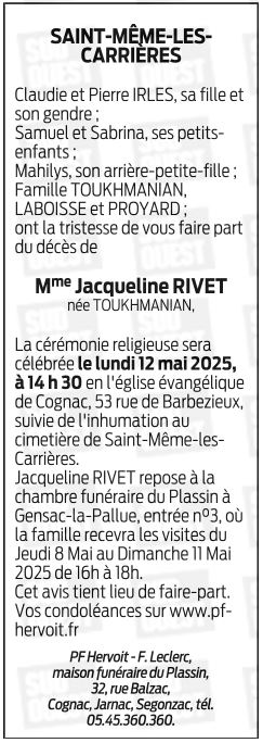 Décédée à Saint-Même-les-Carrières (16720) le mardi 6 mai 2025