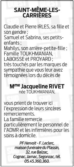 Cet espace « condoléances » est dédié à la mémoire de Madame Jacqueline TOUKHMANIAN.