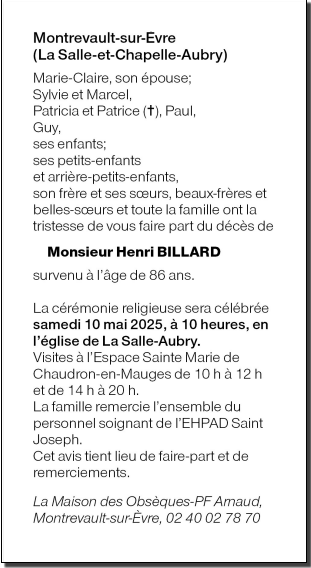 Cet espace « condoléances » est dédié à la mémoire de Monsieur Henri BILLARD.