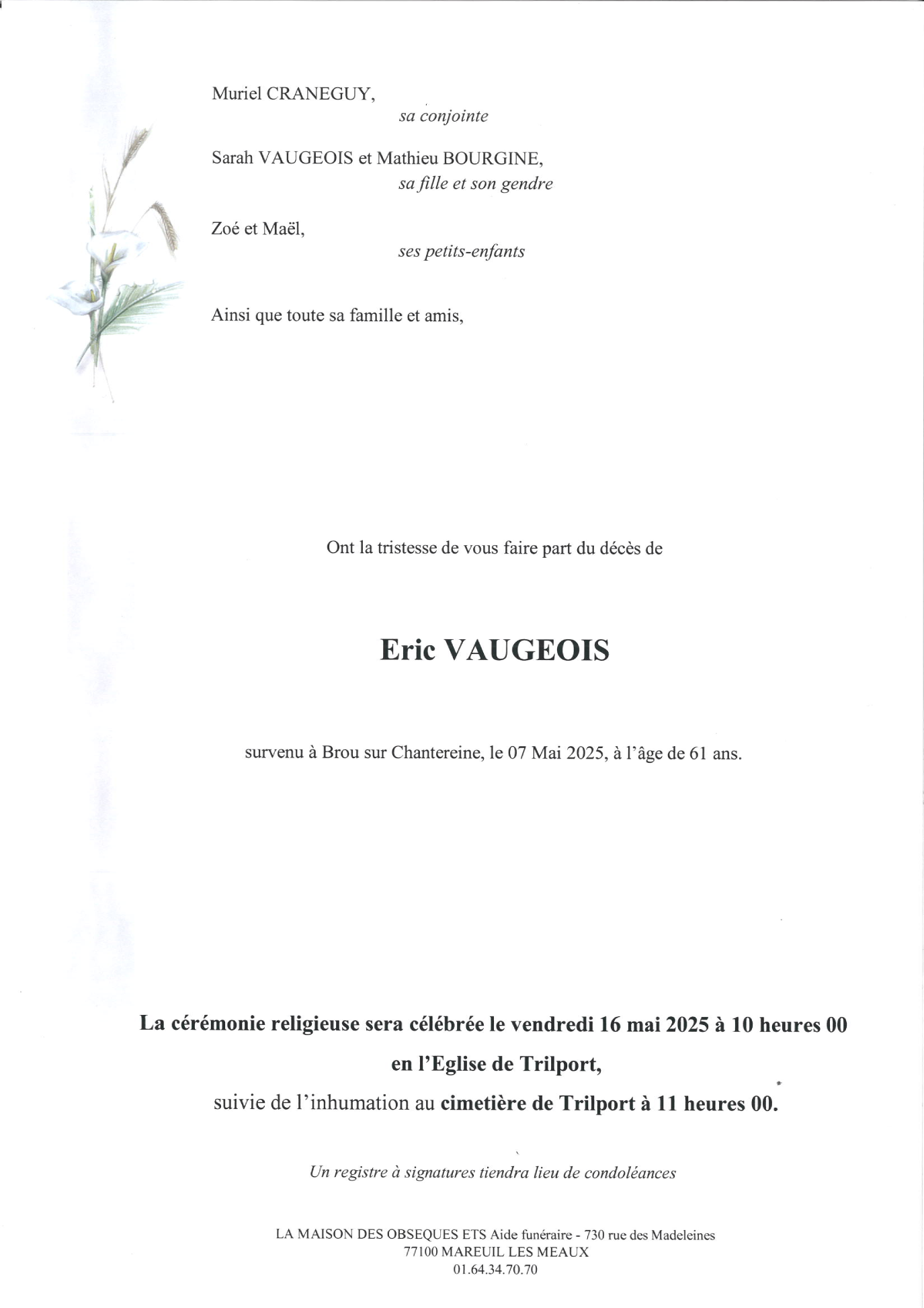 Cet espace « condoléances » est dédié à la mémoire de Monsieur Eric VAUGEOIS.