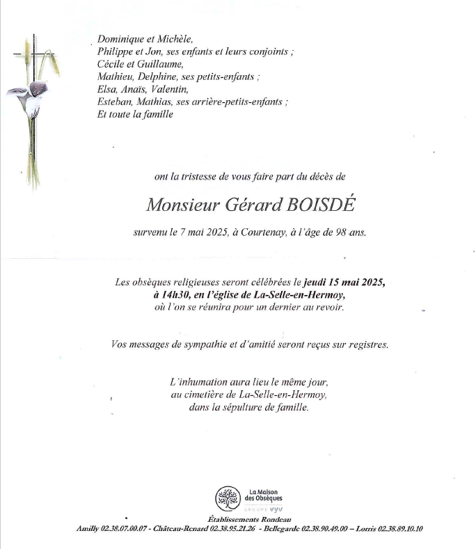 Cet espace « condoléances » est dédié à la mémoire de Monsieur Gérard BOISDÉ.