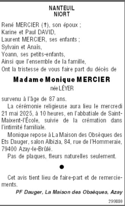 Cet espace « condoléances » est dédié à la mémoire de Madame Monique MERCIER née LEYER.