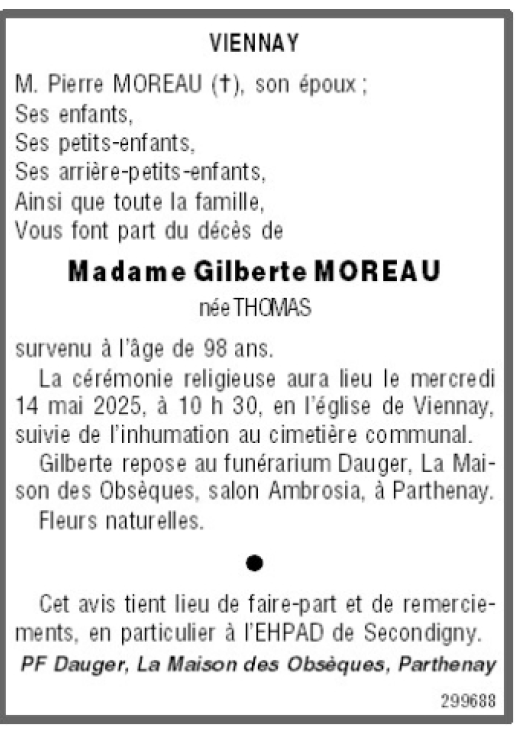 Cet espace « condoléances » est dédié à la mémoire de Madame Gilberte MOREAU née THOMAS.