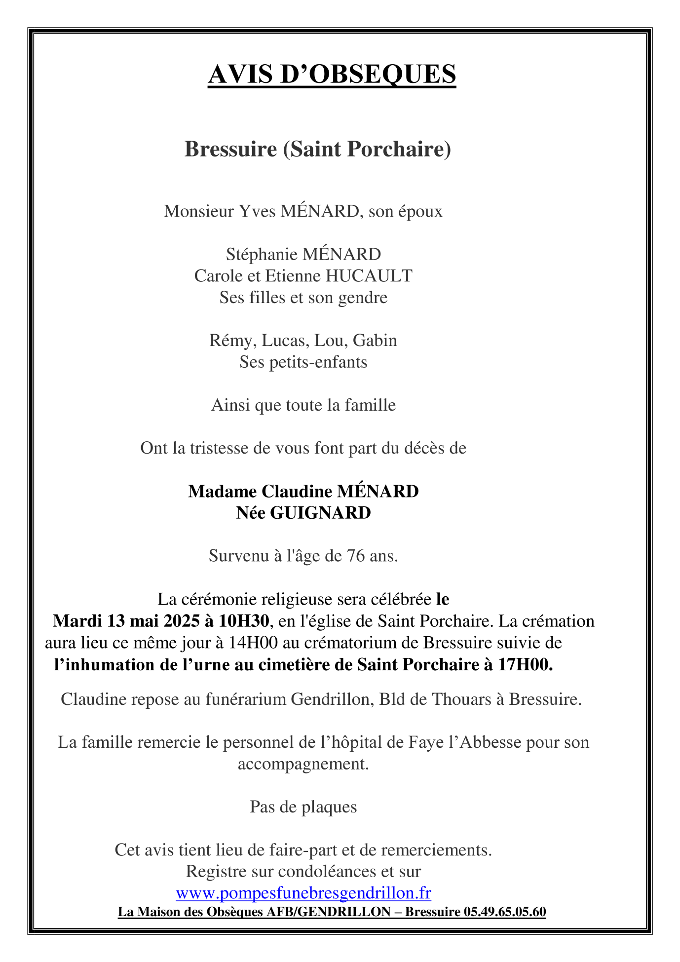 de Madame Claudine MENARD née GUIGNARD