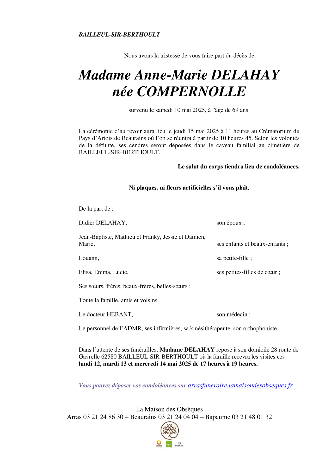Cet espace « condoléances » est dédié à la mémoire de Madame Anne-Marie DELAHAY née COMPERNOLLE.
