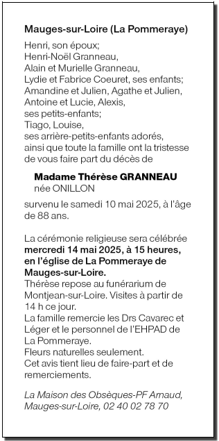 Cet espace « condoléances » est dédié à la mémoire de Madame Thérèse GRANNEAU née ONILLON.