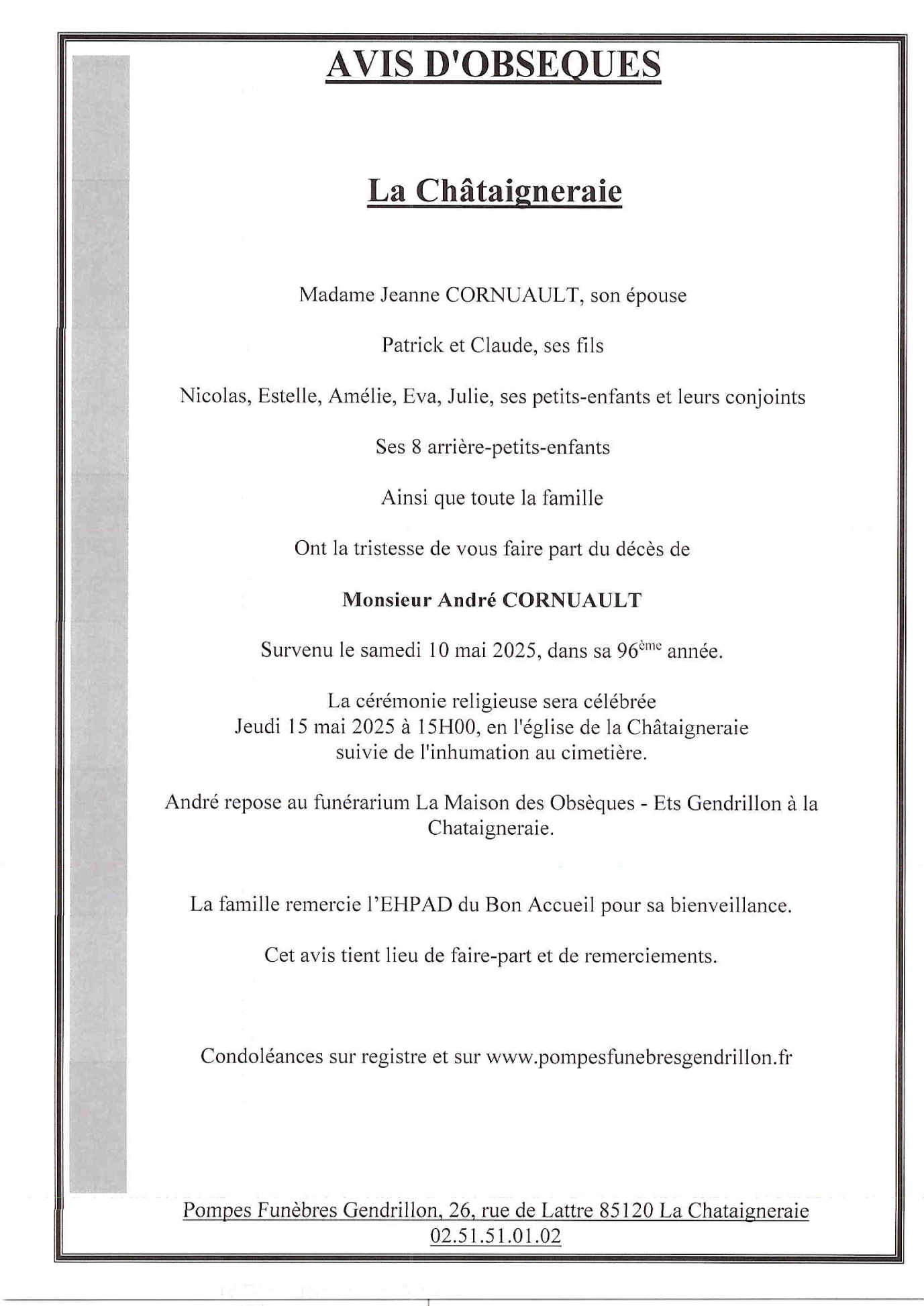 Cet espace « condoléances » est dédié à la mémoire de Monsieur André CORNUAULT.