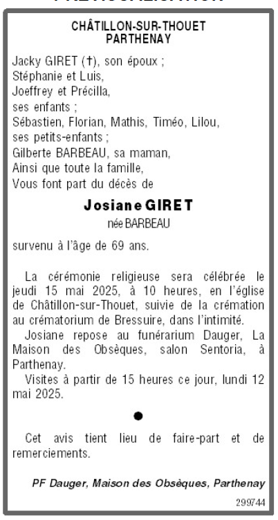 de Madame Josiane GIRET née BARBEAU
