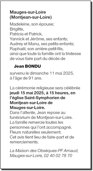 Décédé à Montjean sur Loire (49570) le dimanche 11 mai 2025