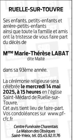 Cet espace « condoléances » est dédié à la mémoire de Madame MARIE-THÉRÈSE LABAT née LABAT.