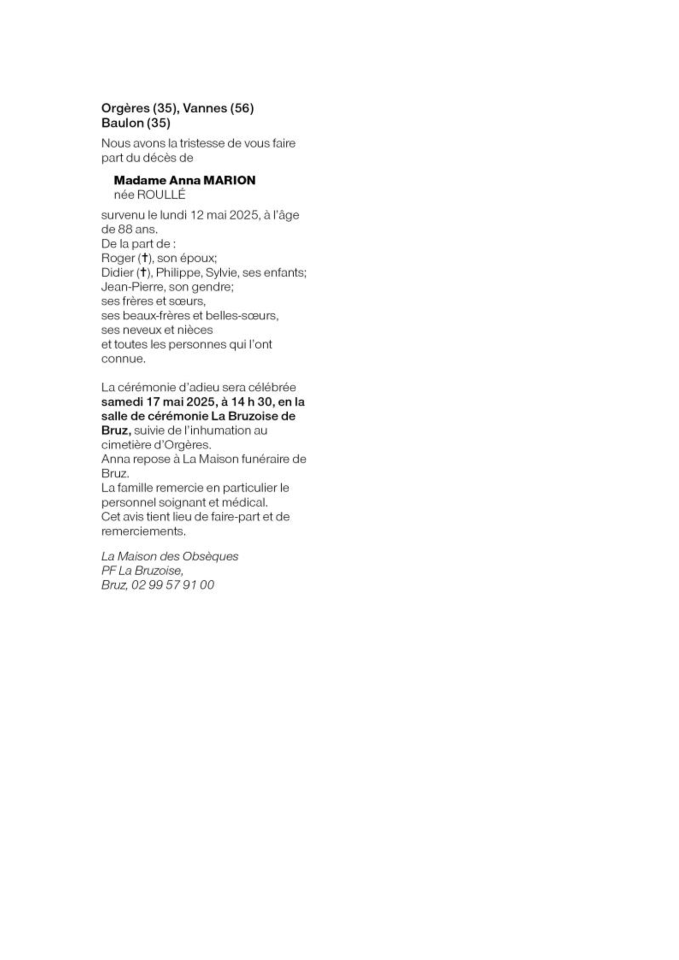Décédée à Janze (35150) le lundi 12 mai 2025
