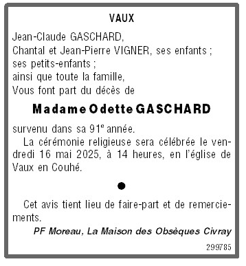Cet espace « condoléances » est dédié à la mémoire de Madame Odette GASCHARD née TEXEREAU.