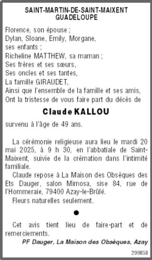 Cet espace « condoléances » est dédié à la mémoire de Monsieur Claude KALLOU.