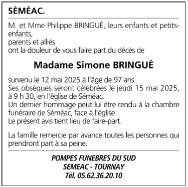 Cet espace « condoléances » est dédié à la mémoire de Madame Marie BRINGUÉ née SAINT-JEAN.