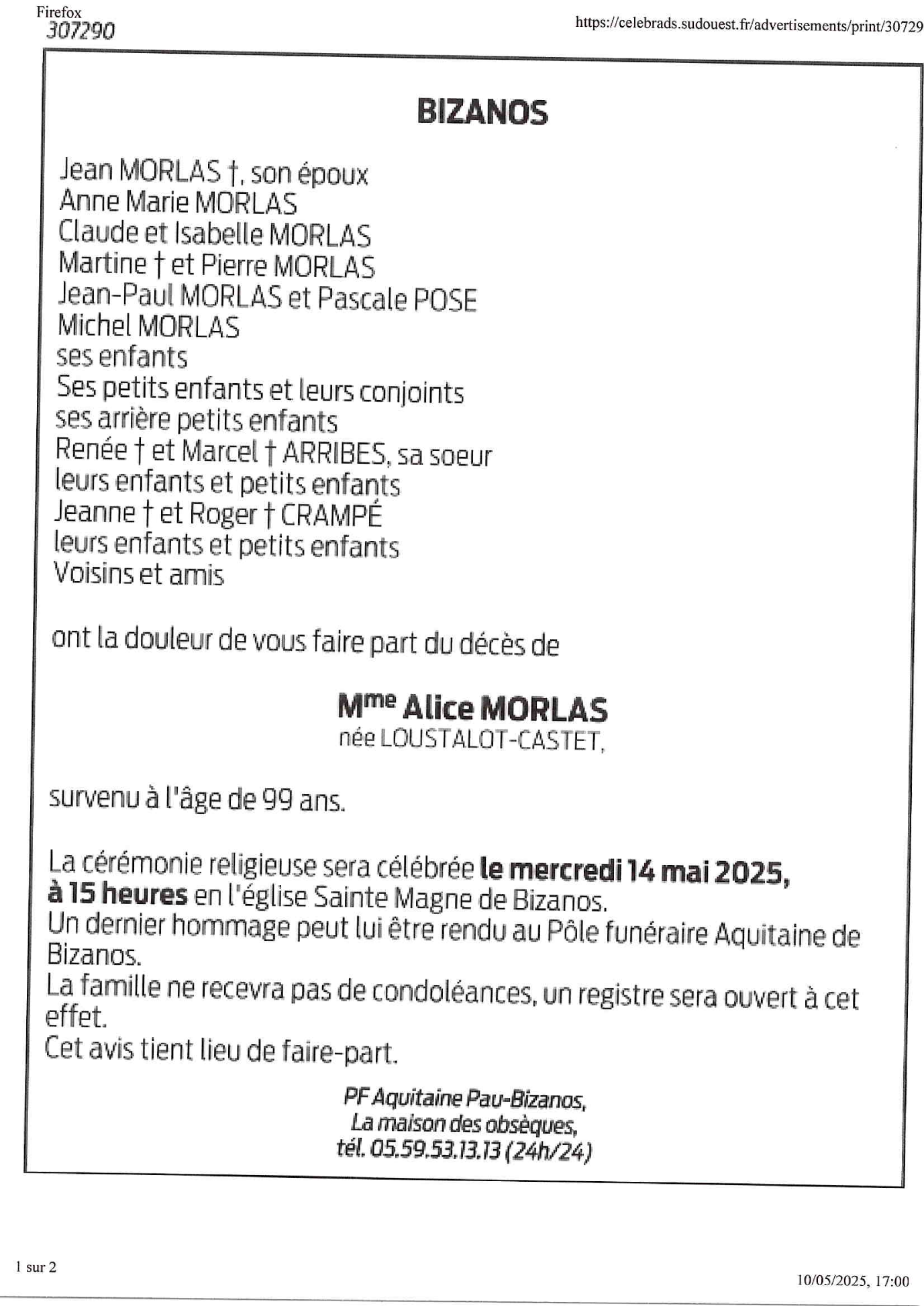 Cet espace « condoléances » est dédié à la mémoire de Madame Alice MORLAS née LOUSTALOT-CASTET.