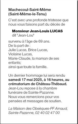Décédé à Saint Même le Tenu (44270) le mardi 13 mai 2025