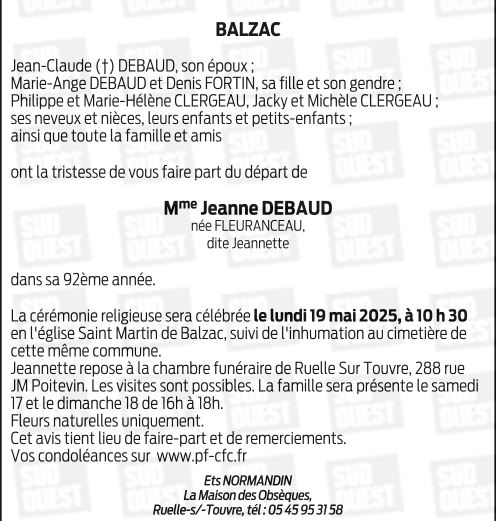 Cet espace « condoléances » est dédié à la mémoire de Madame JEANNE DEBAUD née FLEURANCEAU.