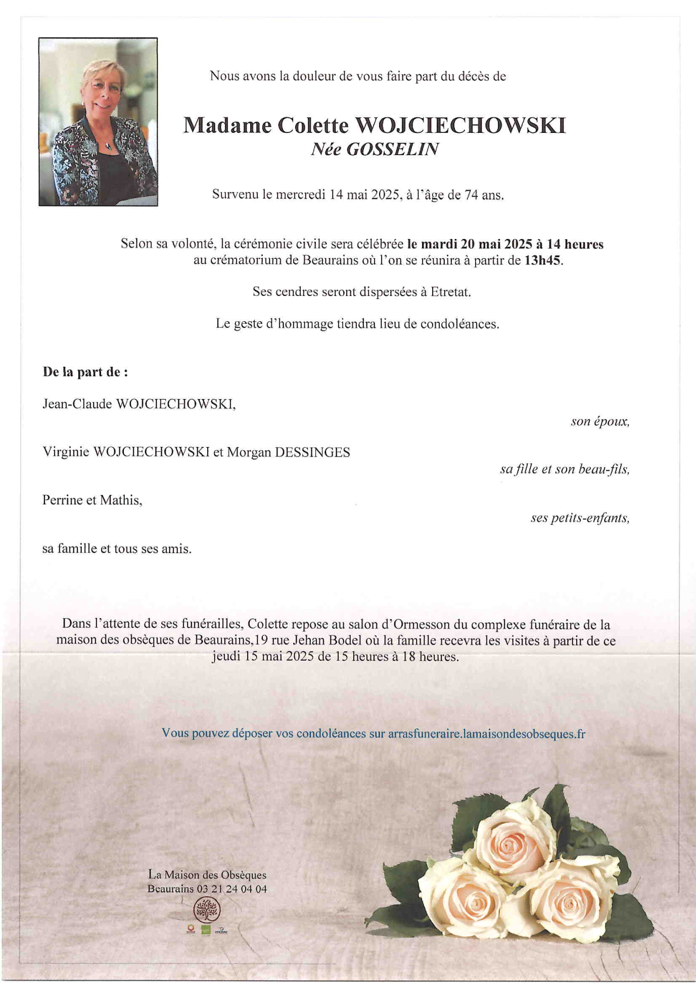 de Madame Colette WOJCIECHOWSKI née GOSSELIN