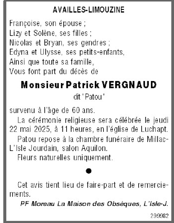 Cet espace « condoléances » est dédié à la mémoire de Monsieur Patrick VERGNAUD.