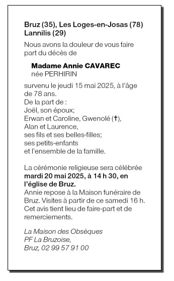 Cet espace « condoléances » est dédié à la mémoire de Madame Annie CAVAREC née PERHIRIN.