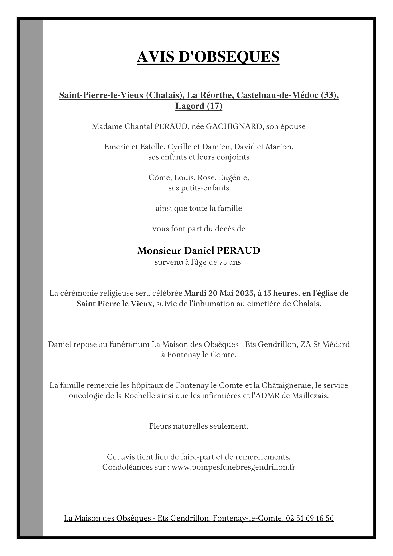 Cet espace « condoléances » est dédié à la mémoire de Monsieur Daniel PERAUD.