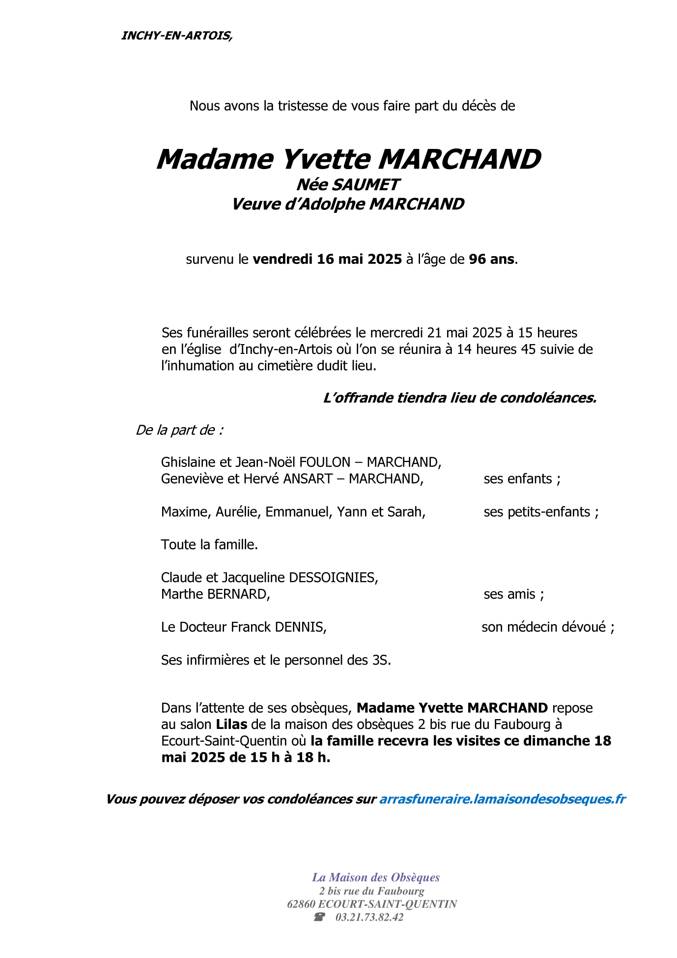 Cet espace « condoléances » est dédié à la mémoire de Madame Yvette MARCHAND née SAUMET.