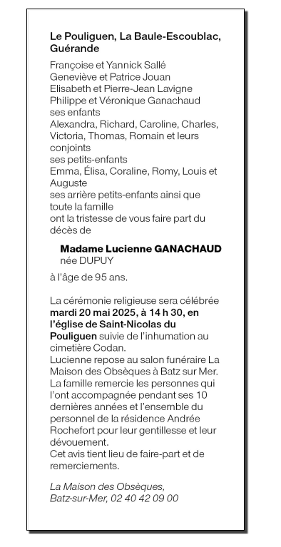 Cet espace « condoléances » est dédié à la mémoire de Madame Lucienne GANACHAUD née DUPUY.