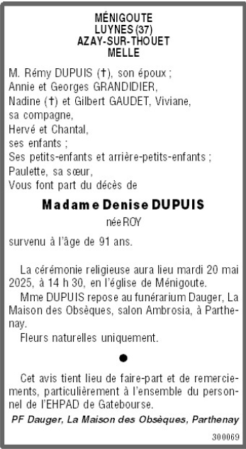 Cet espace « condoléances » est dédié à la mémoire de Madame Denise DUPUIS née ROY.