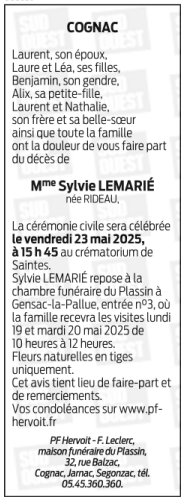Cet espace « condoléances » est dédié à la mémoire de Madame Sylvie LEMARIÉ née RIDEAU.