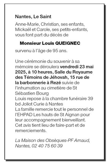 Cet espace « condoléances » est dédié à la mémoire de Monsieur Louis QUEIGNEC.