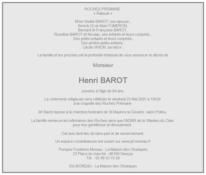 Cet espace « condoléances » est dédié à la mémoire de Monsieur Henri BAROT.