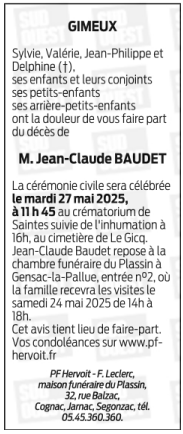 Décédé à Gimeux (16130) le mercredi 21 mai 2025