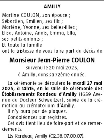 Cet espace « condoléances » est dédié à la mémoire de Monsieur Jean-Pierre COULON.