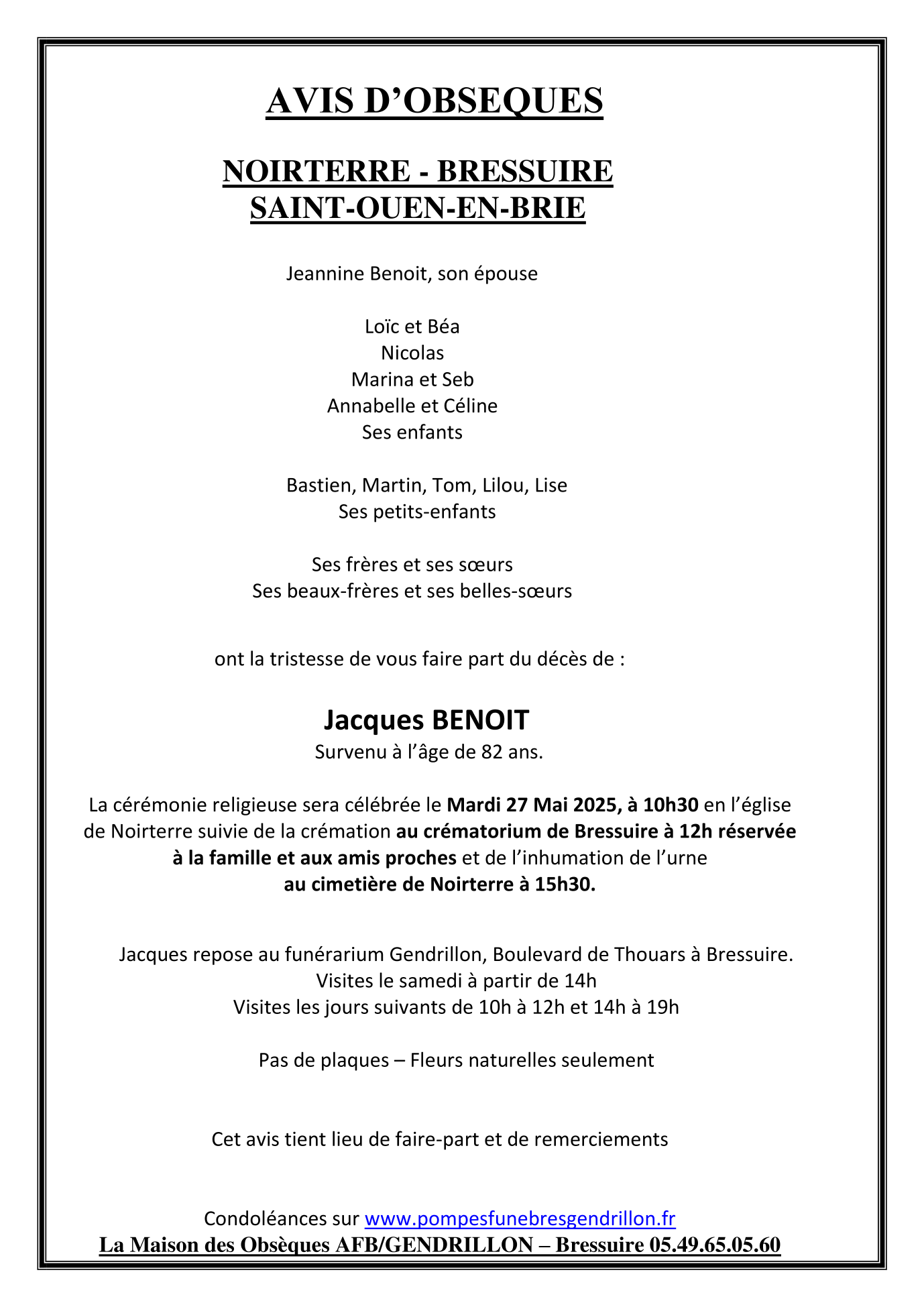 Cet espace « condoléances » est dédié à la mémoire de Monsieur Jacques BENOIT.