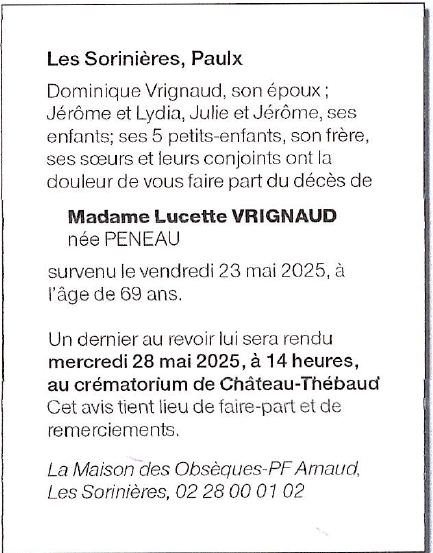 Cet espace « condoléances » est dédié à la mémoire de Madame Lucette VRIGNAUD née PENEAU.