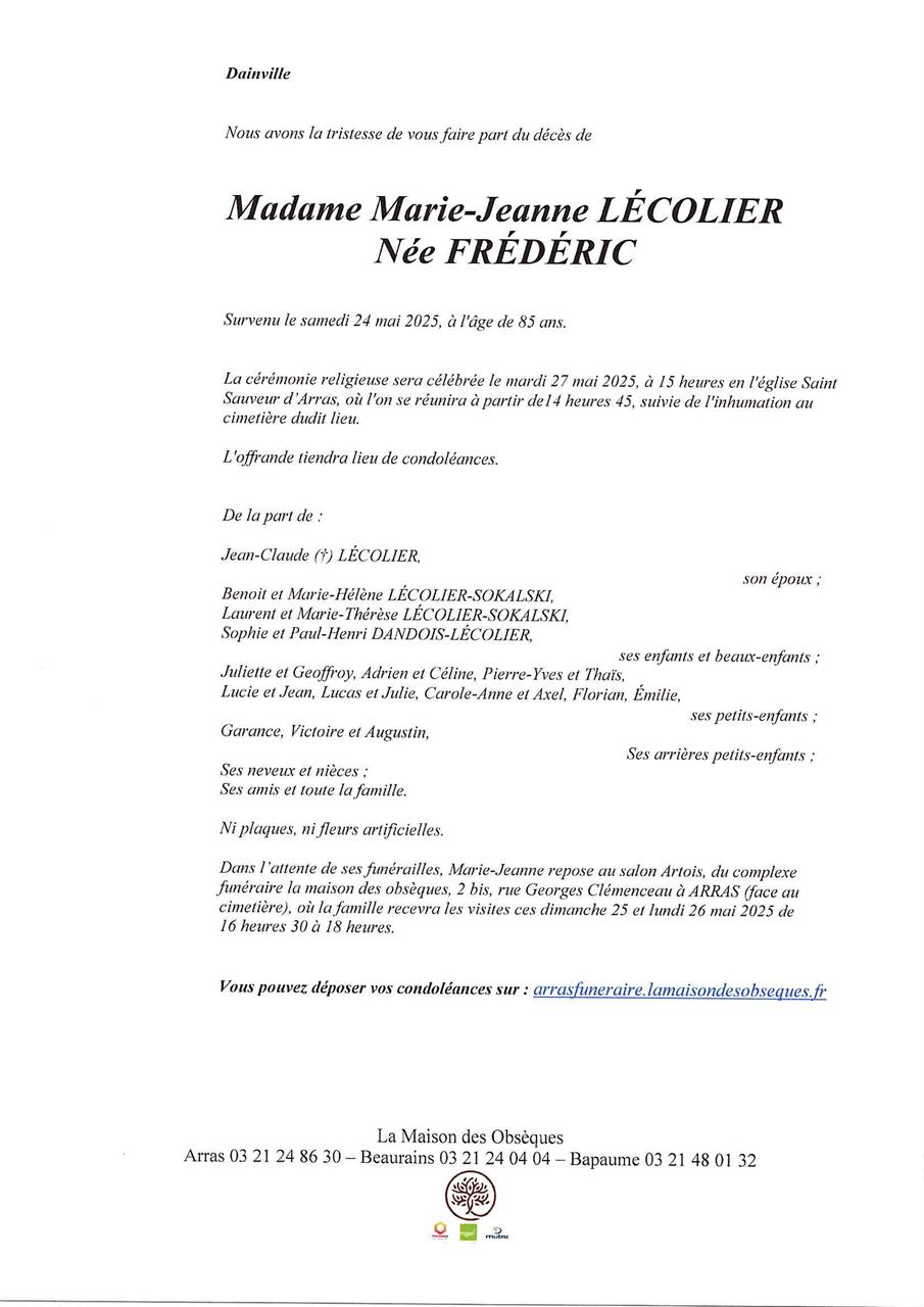 Cet espace « condoléances » est dédié à la mémoire de Madame Marie-Jeanne LÉCOLIER née FRÉDÉRIC.