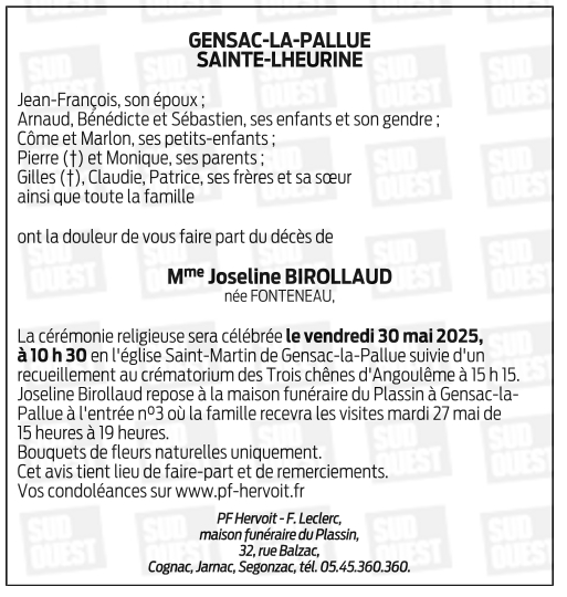 Cet espace « condoléances » est dédié à la mémoire de Madame Joseline BIROLLAUD née FONTENEAU.