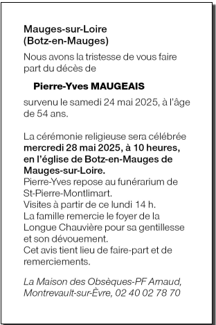 Cet espace « condoléances » est dédié à la mémoire de Monsieur Pierre-Yves MAUGEAIS.
