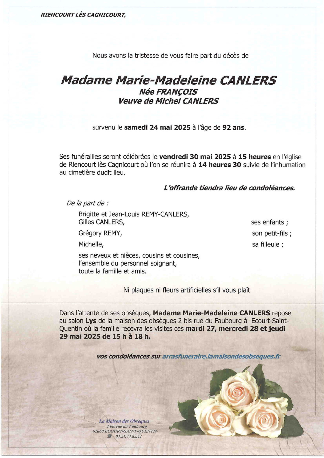 de Madame Marie-Madeleine CANLERS née FRANÇOIS