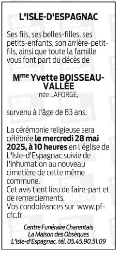 de Madame Yvette BOISSEAU-VALLÉE née LAFORGE