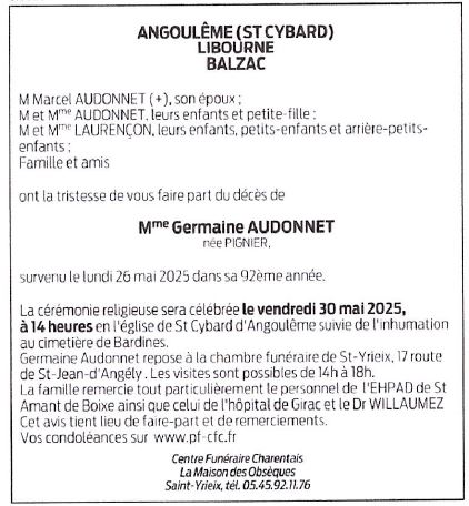 Cet espace « condoléances » est dédié à la mémoire de Madame Germaine AUDONNET née PIGNIER.