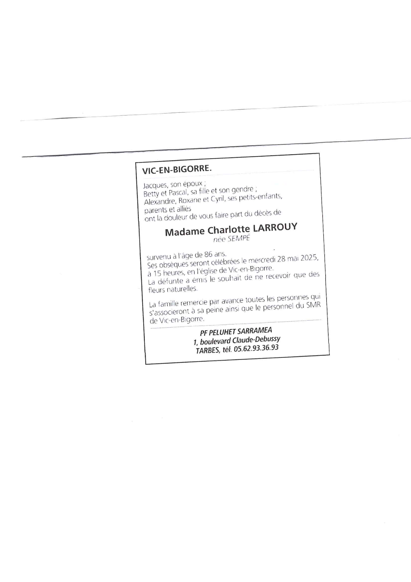 Cet espace « condoléances » est dédié à la mémoire de Madame Charlotte LARROUY née SEMPÉ.